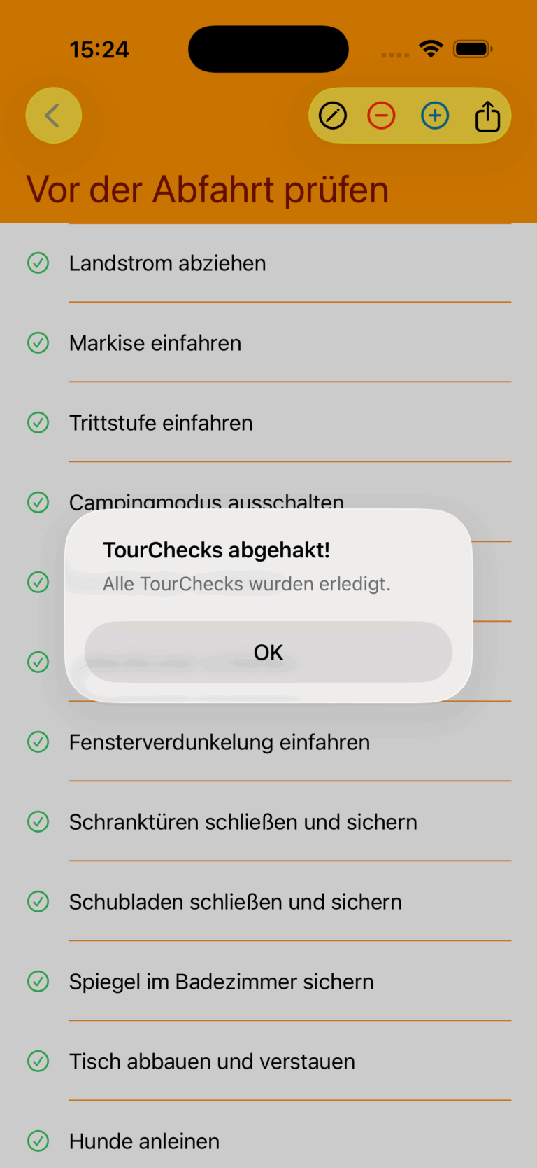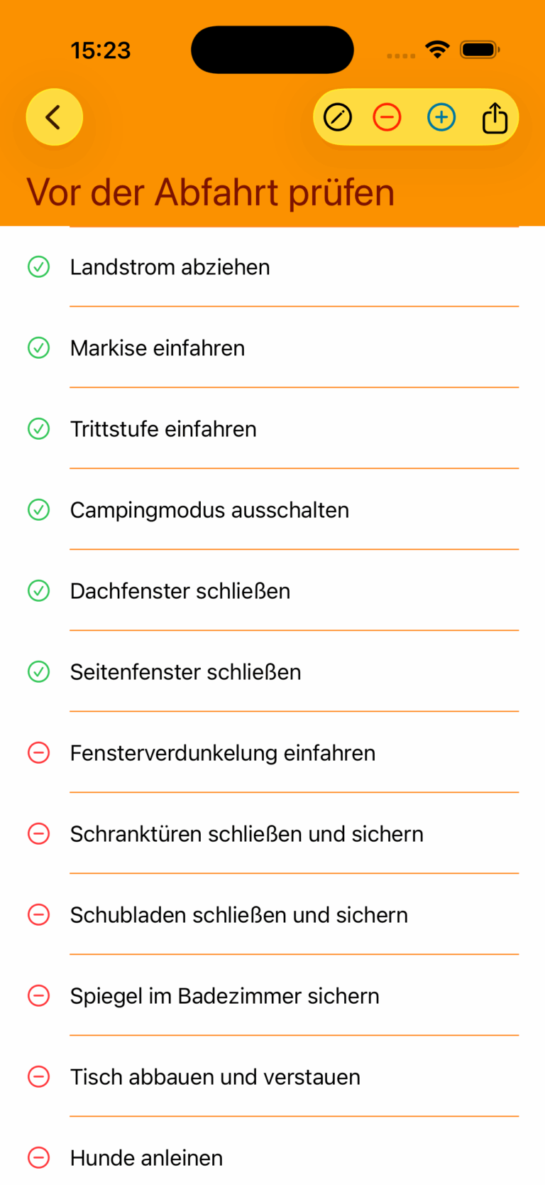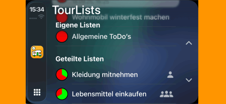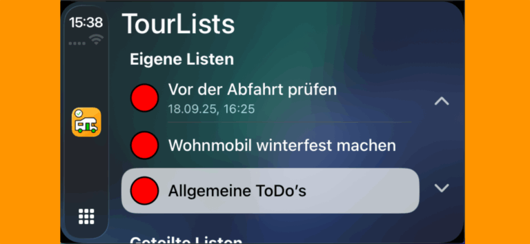 Jetzt können eigene TourListen erstellt werden. Ob für die Prüfung vor der Abfahrt zu einer Tour oder als Erinnerung dafür, welche Punkte erledigt werden müssen, damit das Wohnmobil für die Überwinterung bereit ist. Oder als Liste für die Übergabe des Wohnmobils o. Ä. zur Vermietung oder zum Verkauf.
